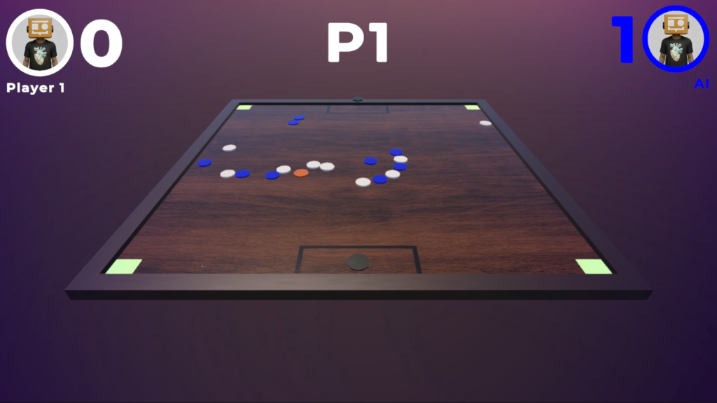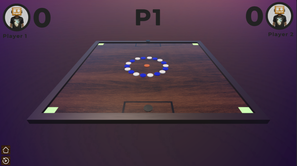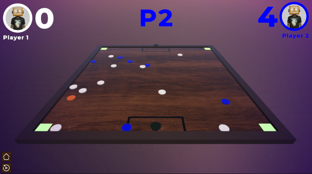 – Players take turns flicking the striker to hit coins or discs into pockets.